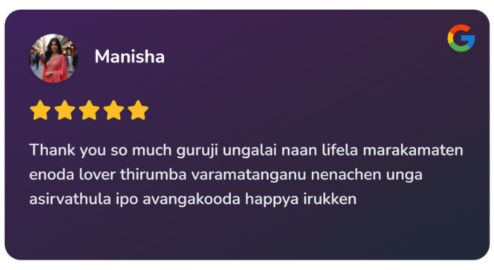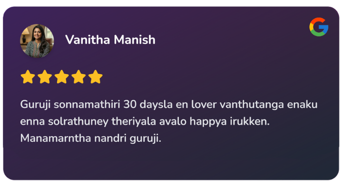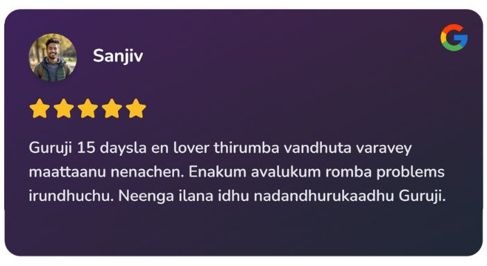 8 ஆண்டுகளுக்கு மேலாக மாந்திரீகம் செய்து வருகின்றார்! 3000+ மேற்பட்டோர்களுக்கு வசியம், தொழில் வசியம் மற்றும் பல பிரச்சனைகளுக்கு தீர்வு அளித்தவர். உங்கள் வாழ்க்கையிலும் சந்தோஷம், வளம் மற்றும் அமைதியை கொண்டு வர எங்கள் குருஜியை அணுகுங்கள்!